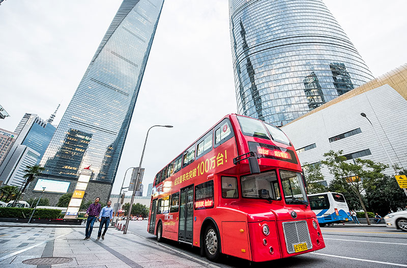 上海「都市観光」観光バスは、上海市観光局が上海市交通委員会と共同で2010年に承認し、上海春秋国際旅行社(グループ)有限公司が単独出資で運営する観光サービスプロジェクトで、2010年10月に運行を開始しました。会社名は蜻蜓観光バス有限公司です。都市観光バスは、赤色車体にグラフィティスタイルの上海名所パターンを配し、訪れる観光客に360度の広大な視野で上海の魅力あふれる風景と著名な景観を存分に楽しませてくれます。各地からの観光客の関心を集め、今や上海の美しい「都市の名刺」となっています。